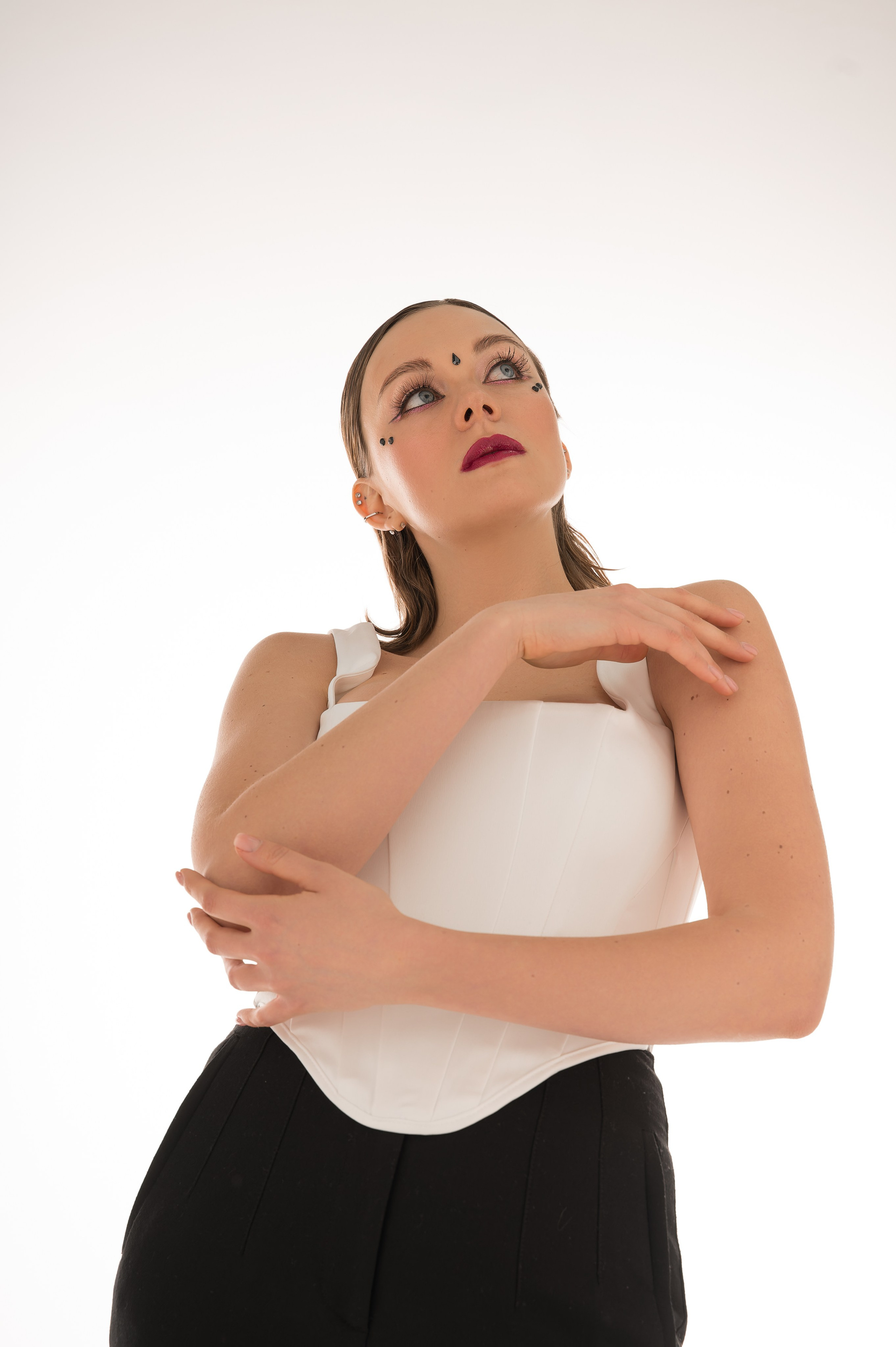 Белая циклорама, мягкий свет и два контрастных образа. Первый — изящность: обтягивающее платье, нежные волны. Второй — графичность: чёрные брюки, белый топ-корсет с чёткими линиями.
